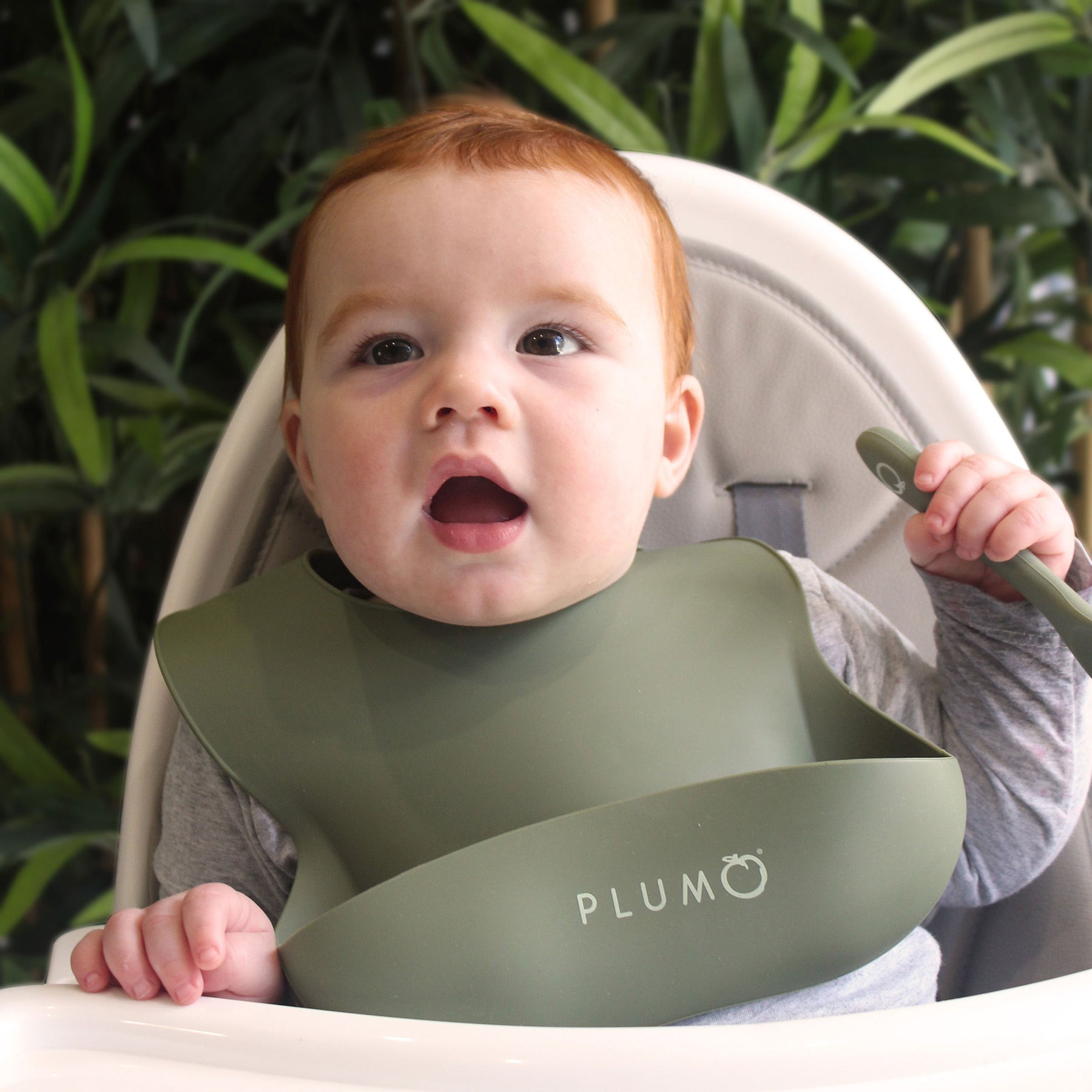 PLUM 3 Piece Silicone Bib and Spoon Set - Olive/Pesto