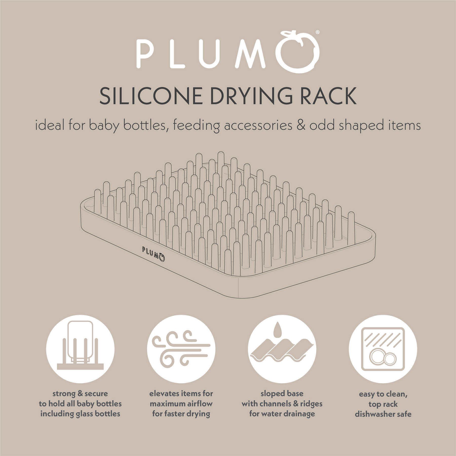 A versatile & practical silicone drying rack, ideal for drying baby bottles, feeding accessories, tableware and all those odd shaped items such as breast feeding parts & accessories. It's strong & secure to hold all baby bottles including glass baby bottles.