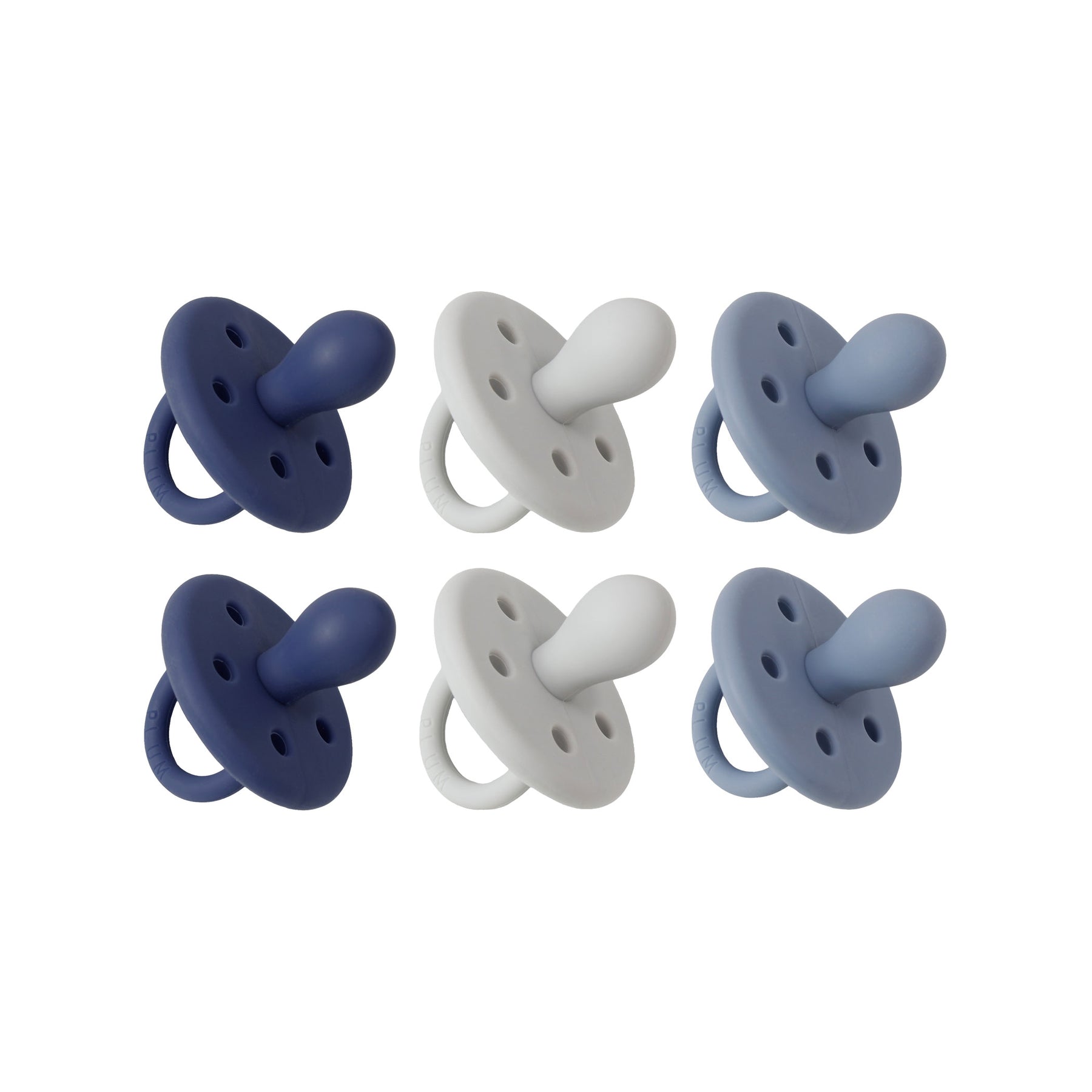 6pcs Silicone Soothers Bundle Girl Pack includes 6 soothers (2x Steel Blue, 2x Navy, and 2x Ash) in the same size (NB-6M).